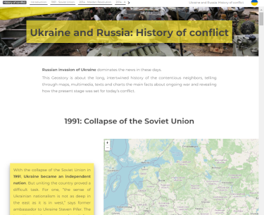 An example of GeoStory can be seen here, where the GeoSolutions team has created a chronicle of the conflict between Ukraine and Russia, composed by texts, images and video footages from main news publishers, linked to interactive maps of the areas involved in the events, to better understand the context and visually follow the events narrated. The Geostory is enriched with dashboards to present in one view statistics on civilian involved in the conflict synchronized with related map, including analysis, graphics and data tables based on data about harms, fatalities and refugees, provided by International Agencies and Non Governative Organizations. Far from being an explanatory article, the Geostory presented can be considered an example of news narration carried out through an immediate and intuitive means of communication represented by the geographical maps of the facts.
